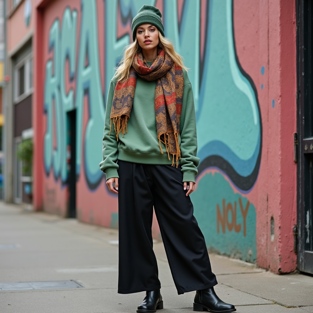 Ein Farbtipp: Neutrale Farben des Sweatshirts lassen sich easy mit knalligen Accessoires aufpeppen, etwa einem bunten Schal im Winter.